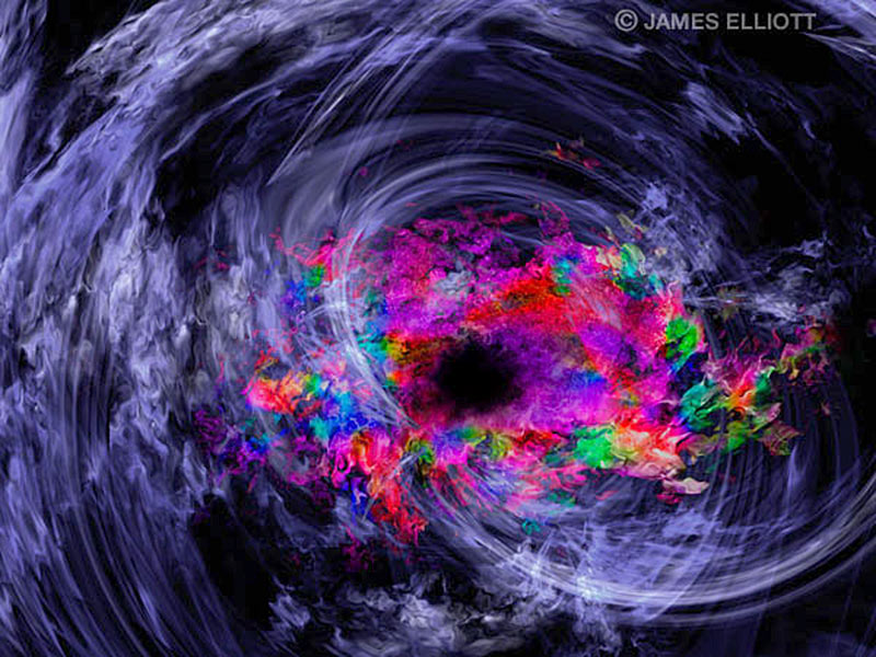 Even Elliott's abstracts are beautiful and almost figurative. His most recent works concern themselves with creation, evolution, metamorphosis and destruction in a nuclear, metaphysical and cosmological sense. Nothing is expressed in a definitive way, but rather an oblique way and the viewer senses certain feelings and is left to draw their own conclusions in a personal way. All the best art is like that. 'The Origin Of Matter' is a hugely ambitious and dynamic work, that few artists could pull off with such credibility. Magnificent use of colour.