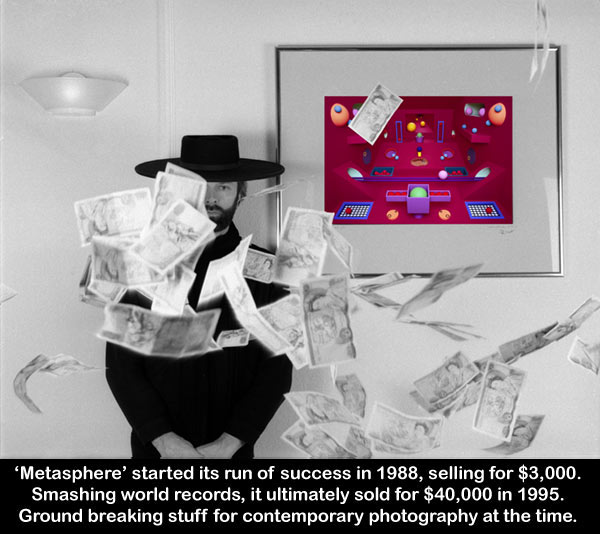 Elliott not only pioneered Photo Art but also the selling of it. In 1988 he sold a 24 inch 'Metasphere' for $3,000. An edition of 10, this was a national record for a contemporary artist photographer and Elliott went on to break the European record and ultimately the world record. This run of success saw 'Metasphere' eventually selling for $40,000 in 1995, having smashed records a staggering five times. These prices were literally unheard of at the time. $40,000 was the price of about 3 new cars. Remember, few thought photography was art back then and even fewer bought it. In order to experience the success, Elliott asked Liz Caron to draw the money from the bank in Shakespeares (£20 notes) and throw it all over him, the better he might experience his success. Elliott not only pioneered photo art, but the selling of it, too. This was all reported in the press and perhaps Elliott did more than any other single photographer, to ignite interest in the contemporary photography market.