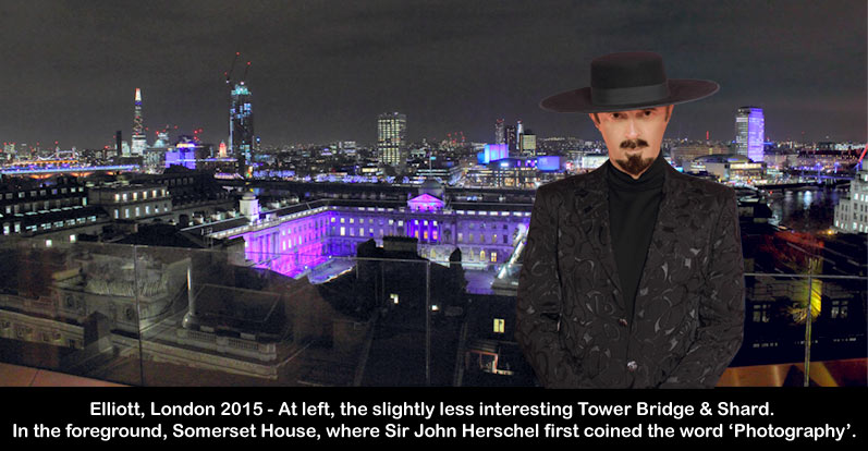 The London Skyline self portrait, above, was taken from one of Elliott's favourite night spots. To the extreme left one can make out Tower Bridge and then the Shard. To the foreground, the building lit by purple lighting is Somerset House, where back in 1839, Sir John Herschel first coined the word 'photography', in a paper read to the Royal Society. Interestingly, the paper was headed 'the art of photography', a status it would not attain for some 150 years. Elliott probably did more than most, to change people's minds. Simply by consistently creating, such beautiful and artistically brilliant photographs, that only an imbecile would say they were not art.