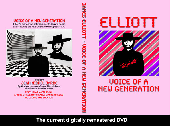 Whilst exhibiting in New York, Elliott's art dealer referred to him as the 'Voice Of A New Generation'. The artist used this as the title for his pioneering, autobiographical video, a completely new idea for visual artists. It was shot on broadcast quality Betacam. Elliott states that every Tom, Dick and Harry was doing a book at the time, so he decided to do a video. Elliott was very fortunate to get permission from Jean MIchel Jarre, to use his music as the soundtrack. 'Voice Of A New Generation' covers the canon up to the final 'Great Symphonies' of the late Eighties. Many have said that the video is a work of art in itself, but Elliott says it was never intended to be. The intention was to be partly biographical, give a glimpse of his lifestyle and present a platform for the Art. The video took hundreds of hours to create but is only 11 minutes long. Elliott digitally re-edited and remastered it himself in 2009 and also turned it into a DVD.