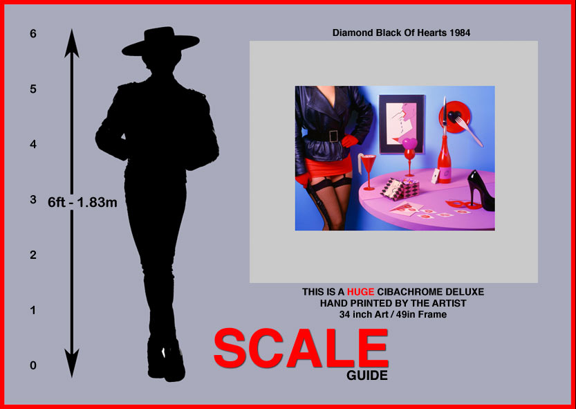 Unique World Edition Of Originals: 9 (1 available) Size Of Piece: 48 x 41 inches Size Of Frame: 34 x 23 inches Original Type: Vintage Cibachrome Deluxe Hand printed by The Artist For Price: Contact Us SIGNED BY THE ARTIST IN STOCK. ARCHIVAL MOUNT. HEAVY METAL FRAME. Cibachromes of this size are very rare in Elliott's work, mostly because of the huge technical challenges with what was a very slow material. This piece for example, took 8 minutes to expose in the artist's darkroom. It required state of the art equipment, which Elliott owned. He often joked that his darkroom 'cost a Ferrari'. There are less than thirty Cibachrome prints this large in the entire collection and the process is long since obsolete. This is perhaps the magnum opus of the erotica. This major work took 247 hours of work to create and was one of Elliott's 'Symphonies for the Camera'. A unique approach, much imitated, which Elliott innovated early Seventies, showing unprecedented creativity, control and attention to detail. It is in some ways, an erotic version of Seventies classic 'Pseudosynthesis' of 1976. Elliott was an artist for more than a decade, before he started creating original, iconic, erotica masterpieces. Between 1979 and 1984 he created about a dozen images which became world famous via international publications. 'Diamond Black Of Hearts' was one of them. What is extraordinary about Elliott's art is his ability to take on a much used genre and do something absolutely fresh. The early erotica was massively influential and launched a million fetish photographers. Elliott is a pioneer in all areas of his Art. He creates everything in his images himself, without assistance - a unique and superior approach. These are masterpieces not assistant-pieces, as is so common today. In this particular piece he even created the painting, the table, the blue wall, the plate, heart and fork, the bottle, the glasses, the playing card, the box, the lip prints.... even the skirt, in order to achieve his absolute vision.