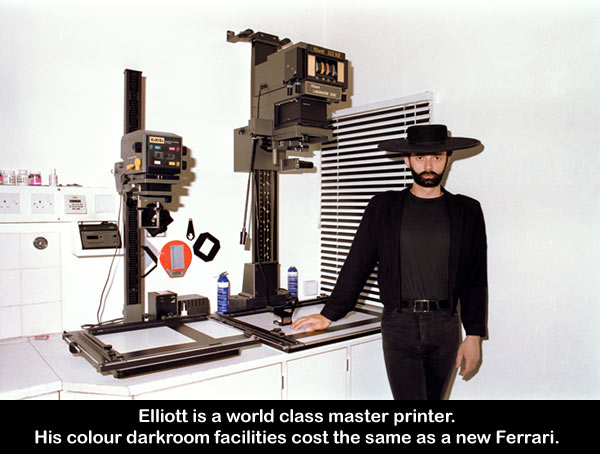 Elliott builds a huge state-of-the-art colour darkroom at Belsize Park NW3. It boasted three large format enlargers, three processing 'robots', thermostatically controlled and filtered water and even a glass chandelier. The equipment alone cost about the same as a Ferrari 308 GTS, at the time.